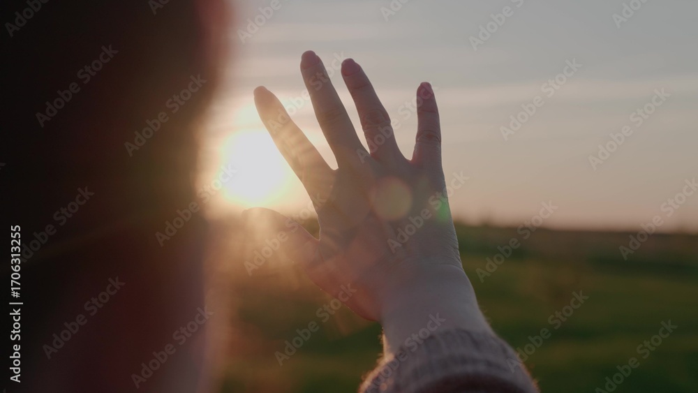 Tableau sur toile sun glare in the sky through your fingers, fantasize hand at a bright sunset, glare in the sky, a woman praying to the sun, travel on vacation, children's place, love to live, make a wish