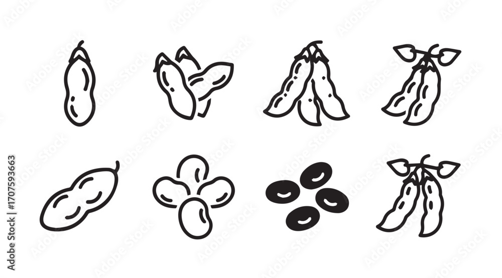 Tableau sur toile Collection of hand drawn soybean pods and beans silhouette