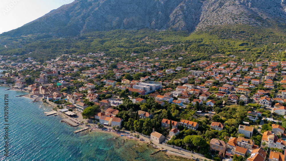 Tableau sur toile A beautiful town with a beach and mountains in the background