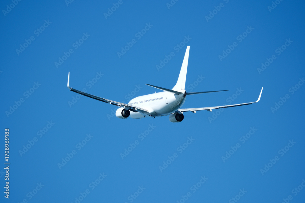 Tableau sur toile The plane that's just taken off drifts away from the airport across clear blue sky