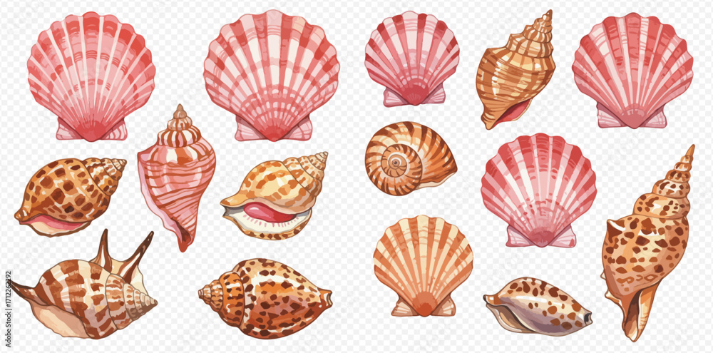 Tableau sur toile A beautiful collection of various hand-drawn seashells in pink, orange, and brown tones on a transparent background