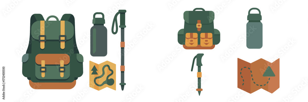 Tableau sur toile Hiking gear setup featuring a backpack, water bottle, trekking pole, and maps fo