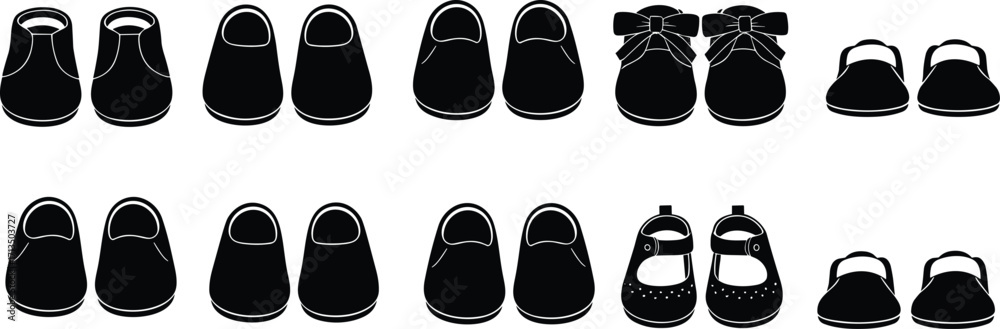 Tableau sur toile Black baby shoe silhouettes in various styles, cute footwear vector illustration