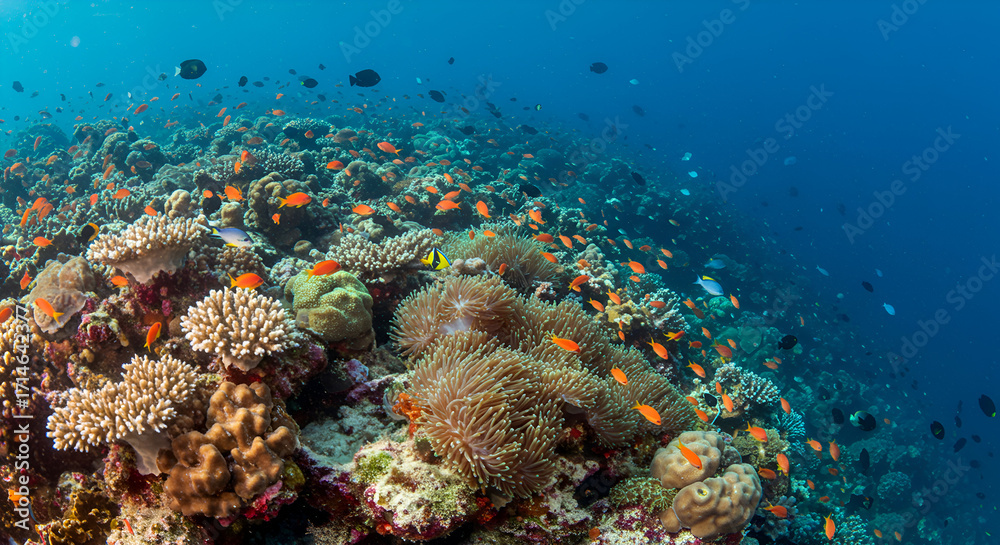 Tableau sur toile A vibrant coral reef ecosystem teeming with colorful fish and diverse marine life in crystal-clear blue waters