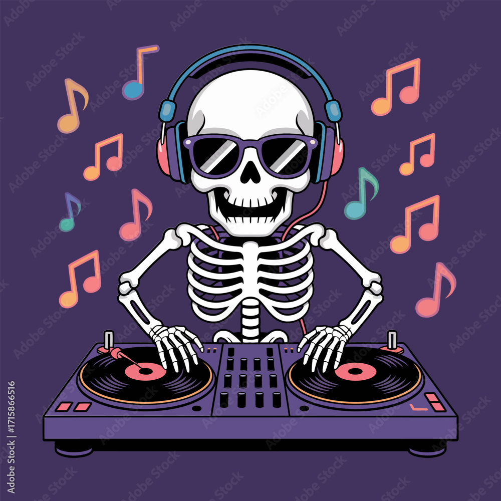 Tableau sur toile cool skeleton dj with headphones, mixing on turntables, music notes around, club