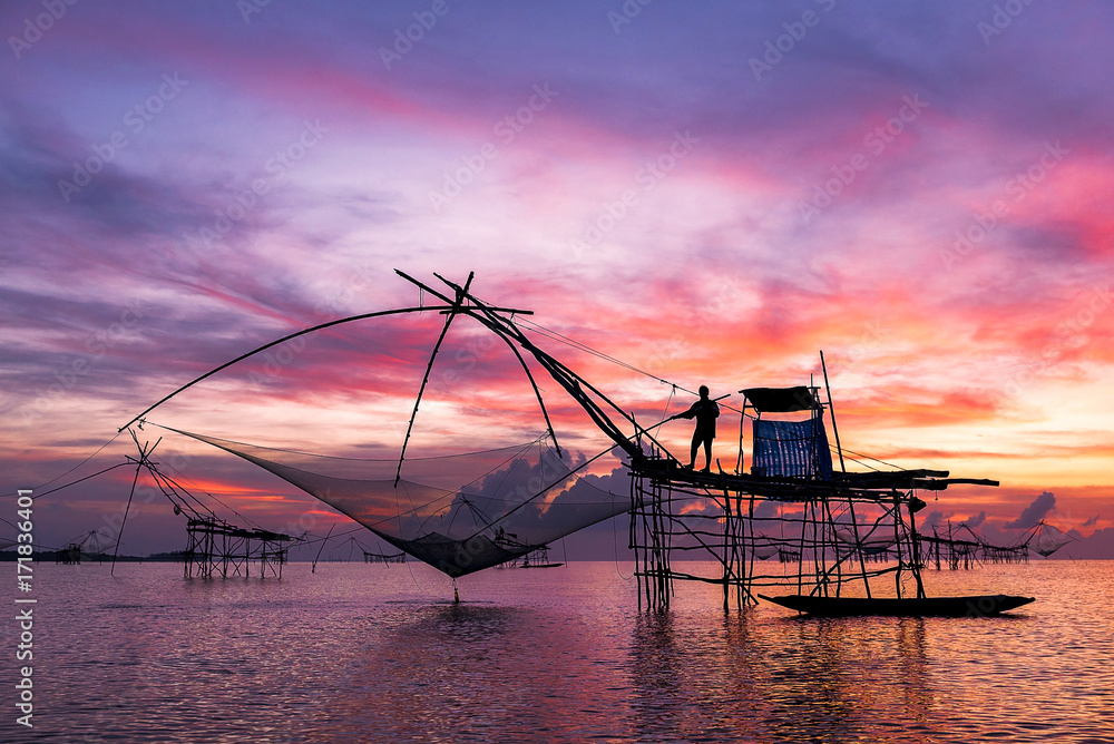 Tableau sur toile fishermen catching prawns early morning in Phatthalung province, Thailand
