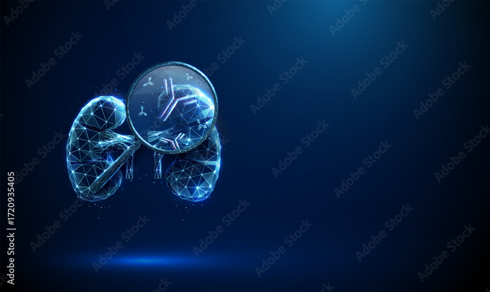 Tableau sur toile Kidney under a magnifying glass with antibodies inside
