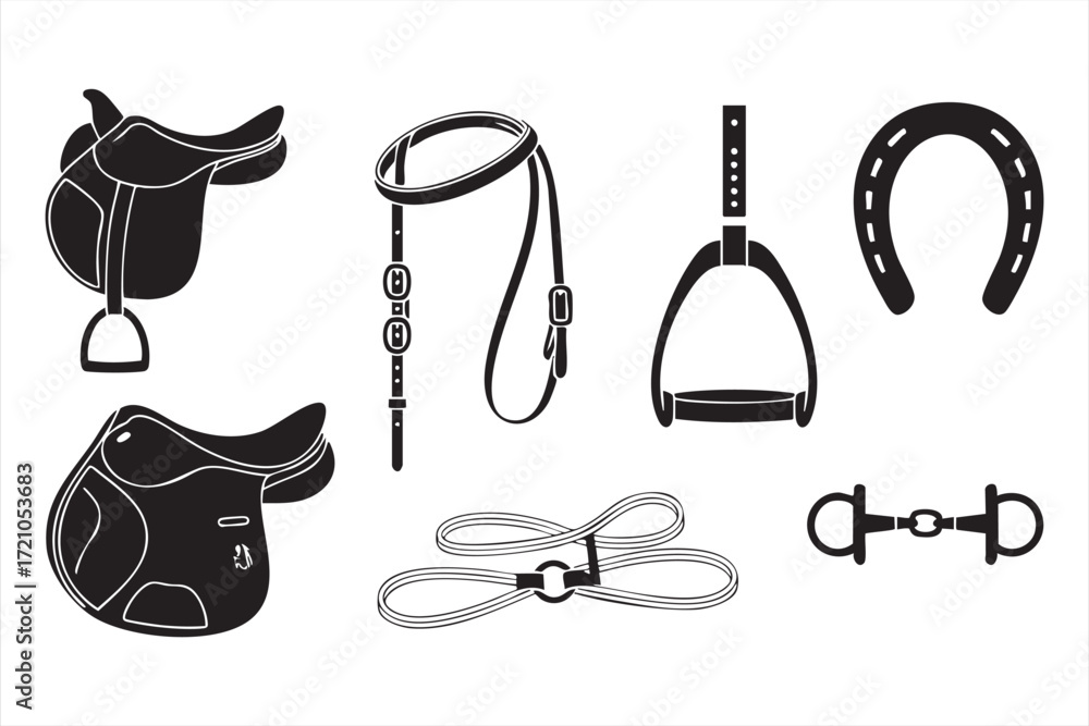 Tableau sur toile Riding equipment and equestrian symbols collection with stirrups and tack items