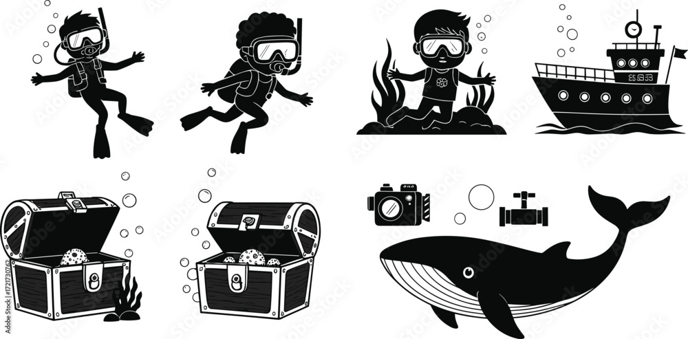 Tableau sur toile Underwater exploration illustration set, scuba divers, child swimming, treasure