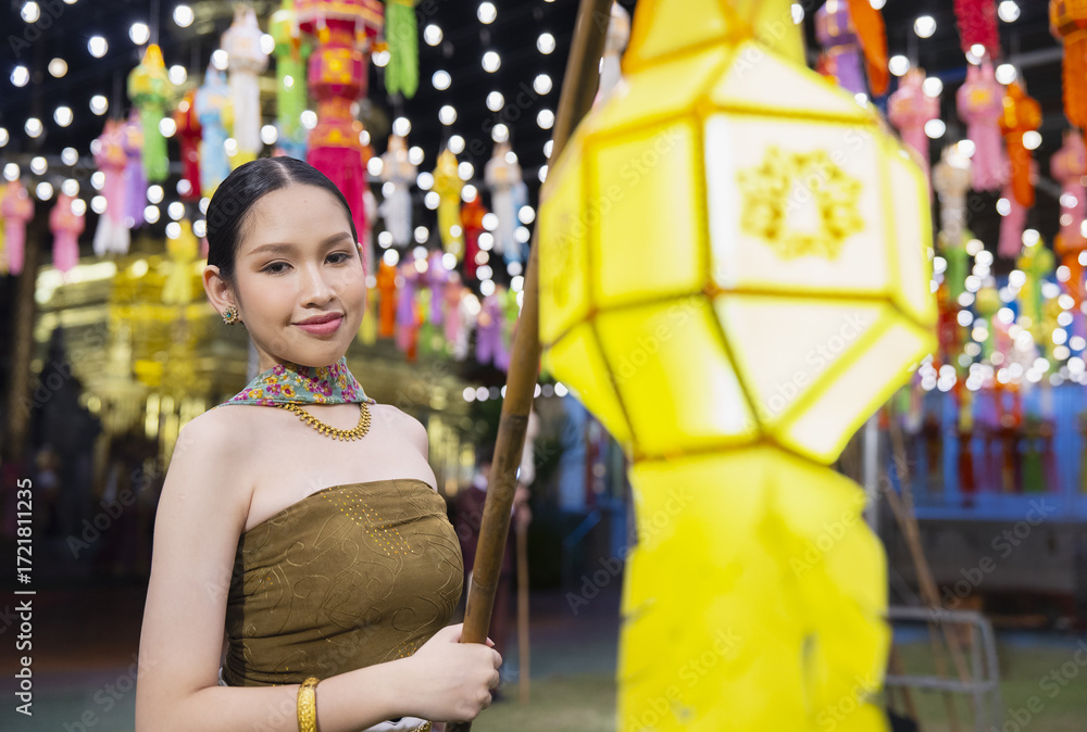 Tableau sur toile Woman in traditional attire stands amidst vibrant lanterns, exuding joyful expre