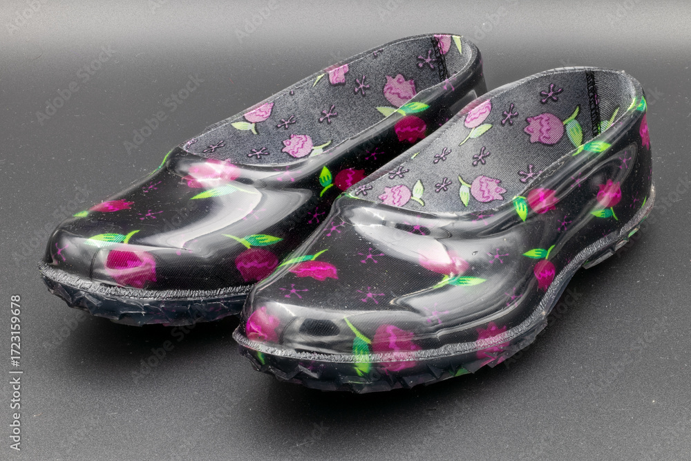 Tableau sur toile Pair of colorful, patterned plastic clogs on a dark background, footwear concept