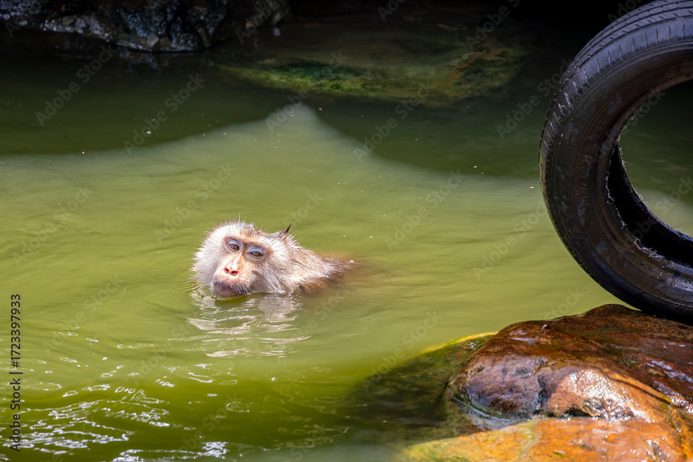 Tableau sur toile a Northern pig-tailed macaque (Macaca leonina) is swimming in pool of GuangZhou Zoo China because of hot weather, which is a species of macaque in the family Cercopithecidae