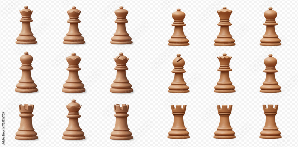 Tableau sur toile A collection of realistic 3D rendered wooden chess pieces, including kings, queens, bishops, and rooks, against a transparent background