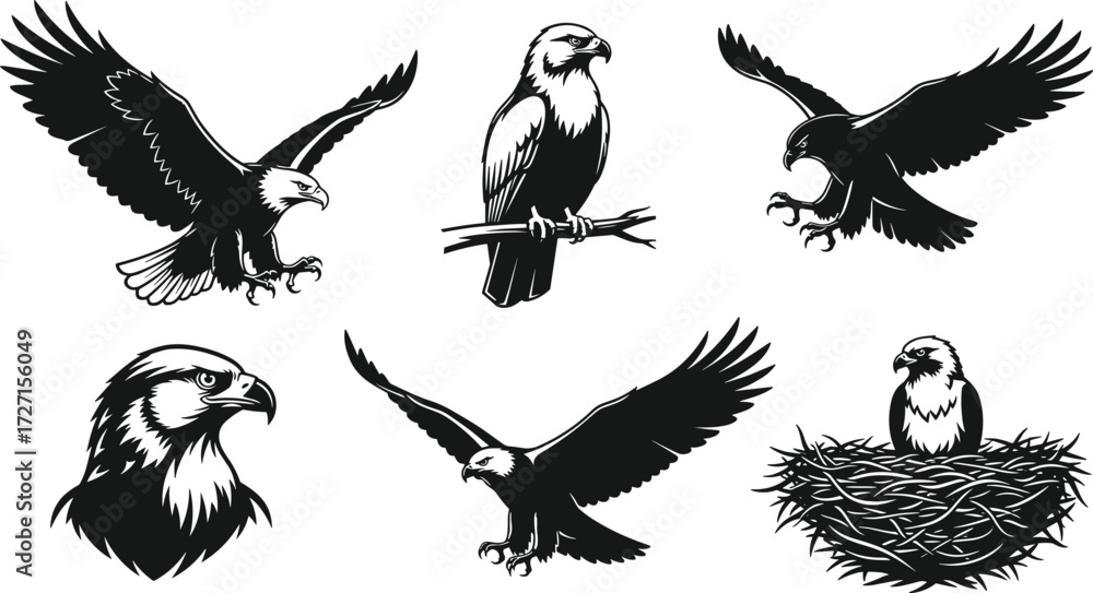 Tableau sur toile Set of bold eagle vector illustrations showing flying, perched, hunting, nesting