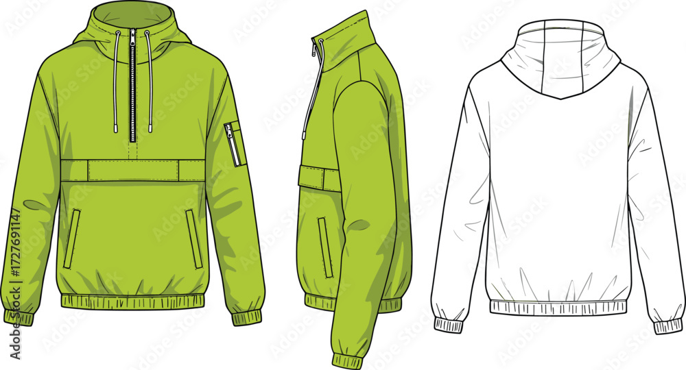 Tableau sur toile Pullover windbreaker jacket flat sketch, anorak half zip hoodie CAD, kangaroo po