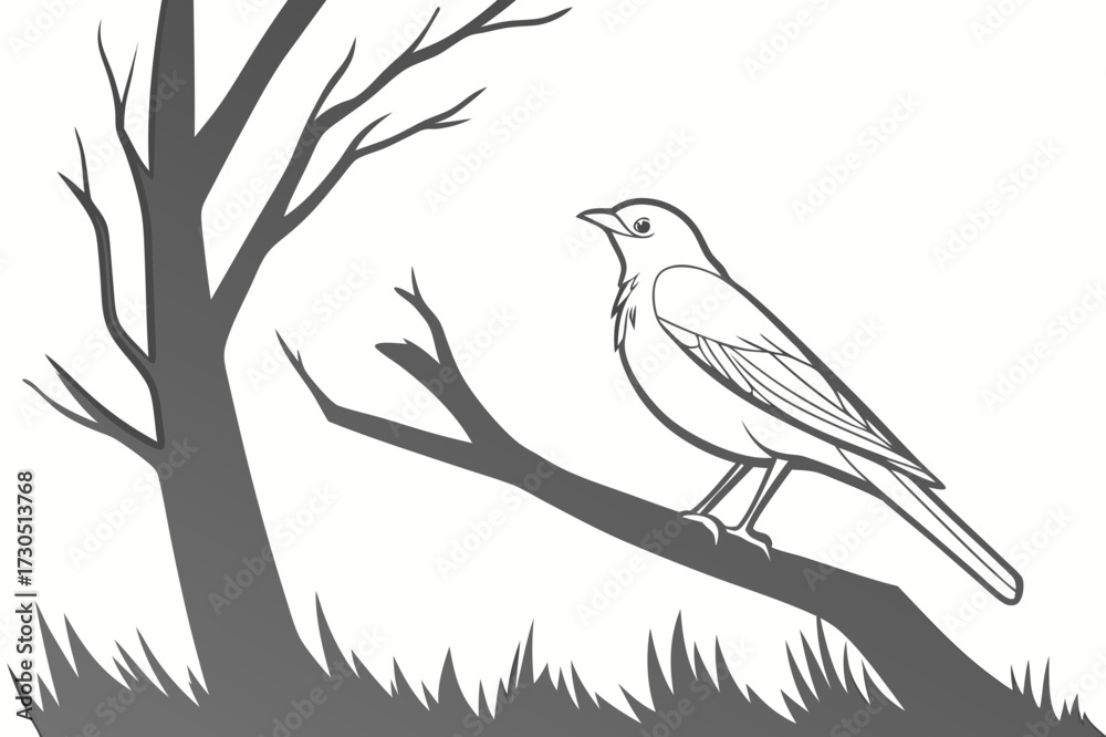 Tableau sur toile Hiker Walking by Windblown Tree Vector Illustration - Monochrome Outdoor Scene