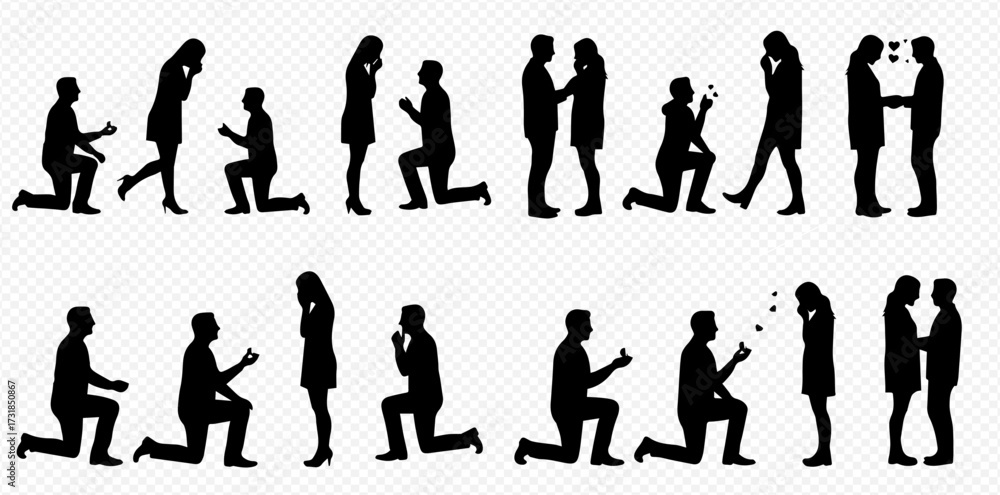 Tableau sur toile Silhouettes of men proposing to women, depicting various stages of a marriage proposal and romantic embrace