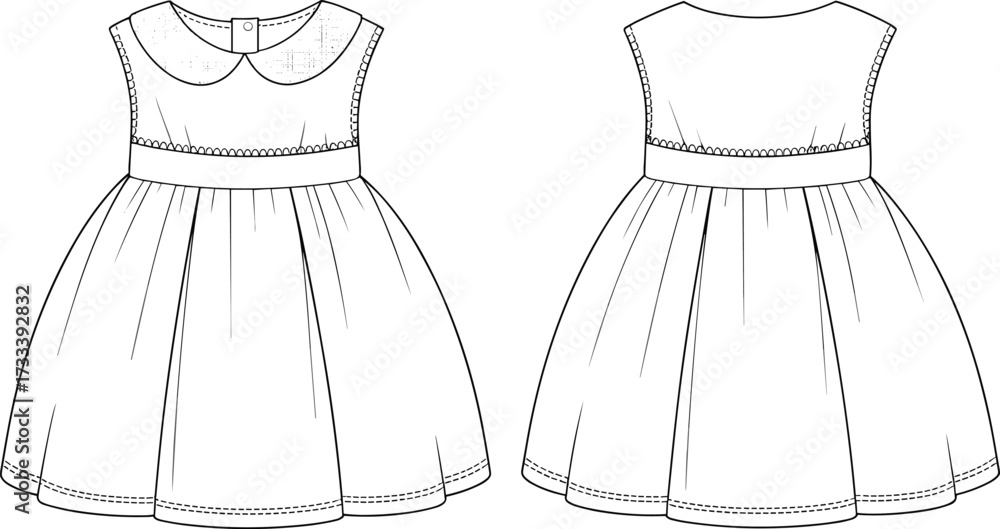 Tableau sur toile Technical Fashion Flat Drawing of a Baby or Toddler Dress with a Peter Pan Collar, Sleeveless Design, and a Waistband with Embroidered Trim for Childrenswear Design Vector
