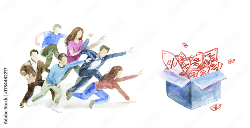Tableau sur toile Watercolor illustration of chaotic people pushing and climbing over each other i