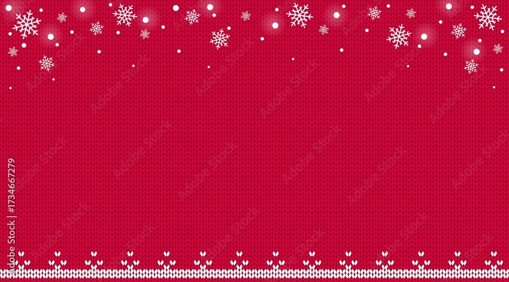 Tableau sur toile Red winter knitted background with falling snowflakes and white ornament