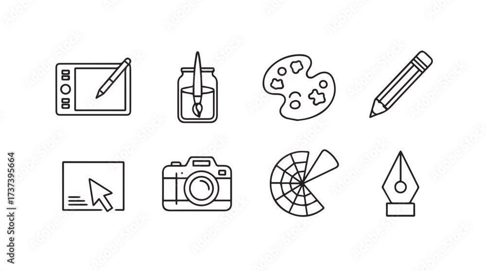 Tableau sur toile Creative tools icons set drawing tablet camera paint palette pencil pen nib and