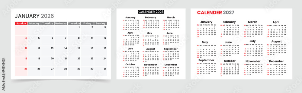 Tableau sur toile 2026 monthly calendar and diary planner. Week Starts on Sunday