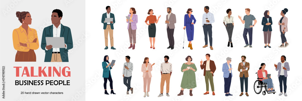 Tableau sur toile Flat vector illustration set of diverse business professionals in modern attire and poses, minimalist corporate people collection, teamwork, communication, diversity, and leadership concept