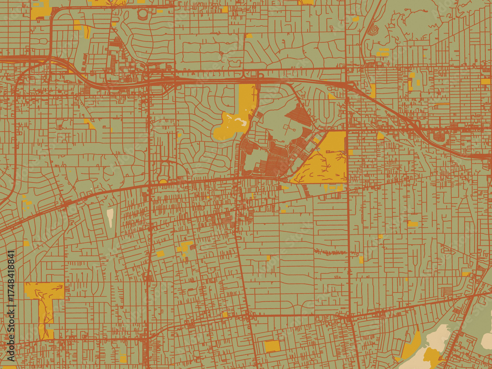 Tableau sur toile Abstract flat-design map of Arcadia, California, featuring olive backdrop with warm rust street network and ochre blocks