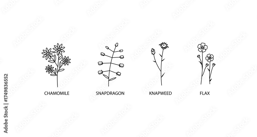 Tableau sur toile Botanical line art of wildflowers: chamomile, snapdragon, knapweed, and flax