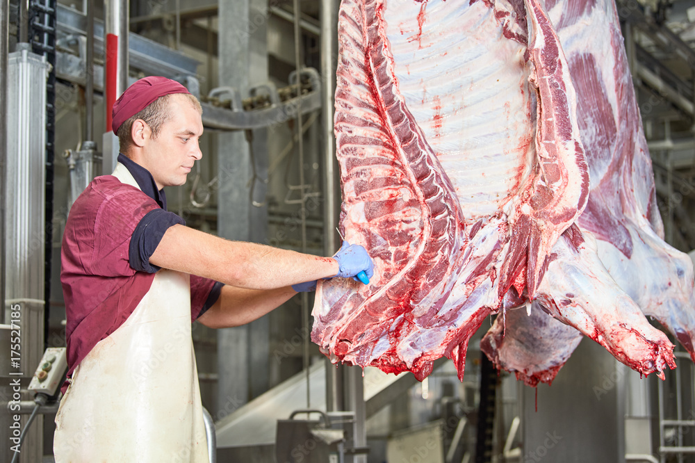 Tableau sur toile meat manufacturing factory. butcher cutting beef carcass