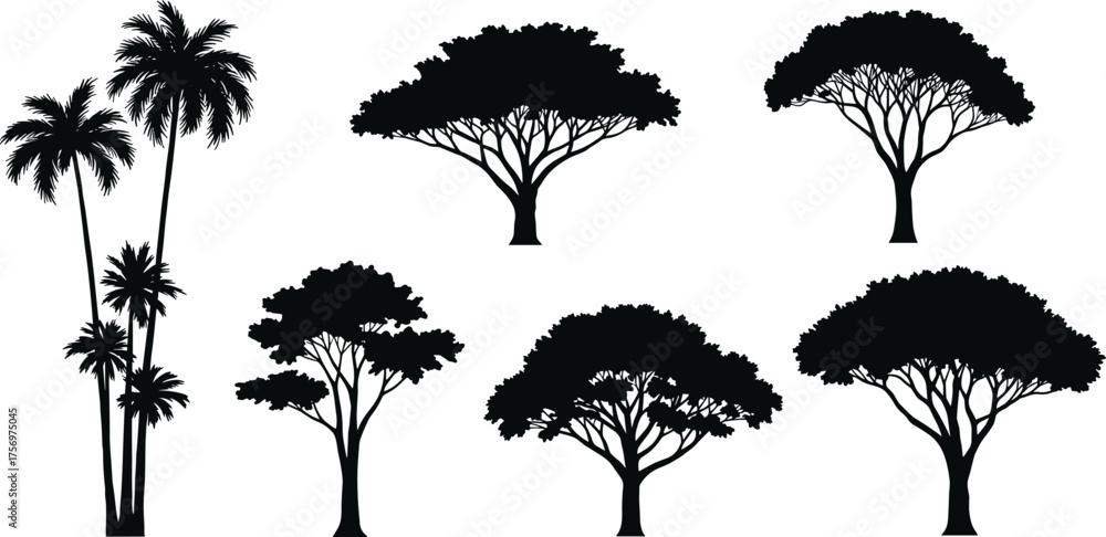 Tableau sur toile Collection of tropical and acacia tree silhouettes, African savanna forest vecto