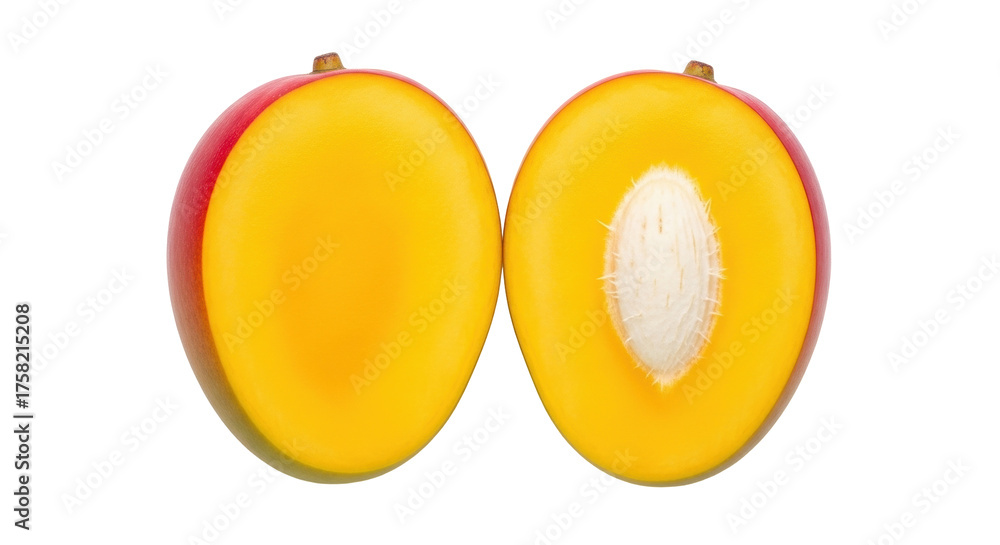 Tableau sur toile Isolated halved mango fruit, vibrant colors, showing yellow flesh and a large wh