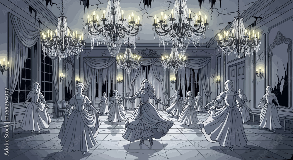 Tableau sur toile Eerie ballroom scene with spectral dancers in vintage gowns beneath ornate, cobweb-draped chandeliers