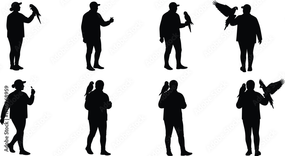 Tableau sur toile Bird interaction silhouette set, people with parrots, pet bird vector, avian car