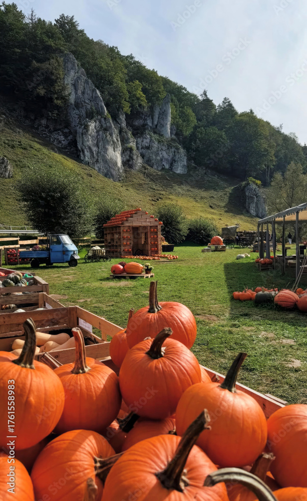 Tableau sur toile Idyllic pumpkin patch beneath towering cliffs, a whimsical tableau of autumn's e