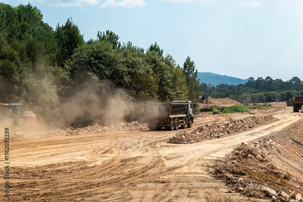 Tableau sur toile Caminhão em ação no transporte de terras para a construção de uma autoestrada, l