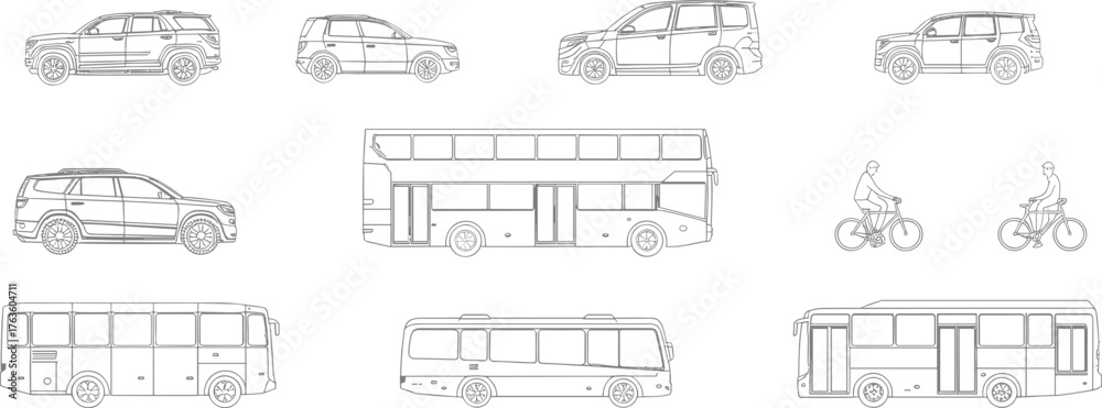 Tableau sur toile Detailed technical line art illustration showing various transportation vehicles
