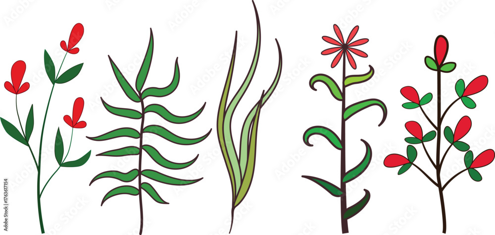 Tableau sur toile Collection of five hand-drawn botanical illustrations: red flowers, green fern,