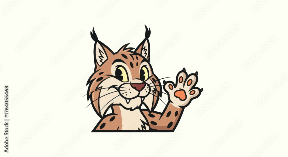 Tableau sur toile Cartoon bobcat waving, brown and tan fur with black accents and paw pads, over w