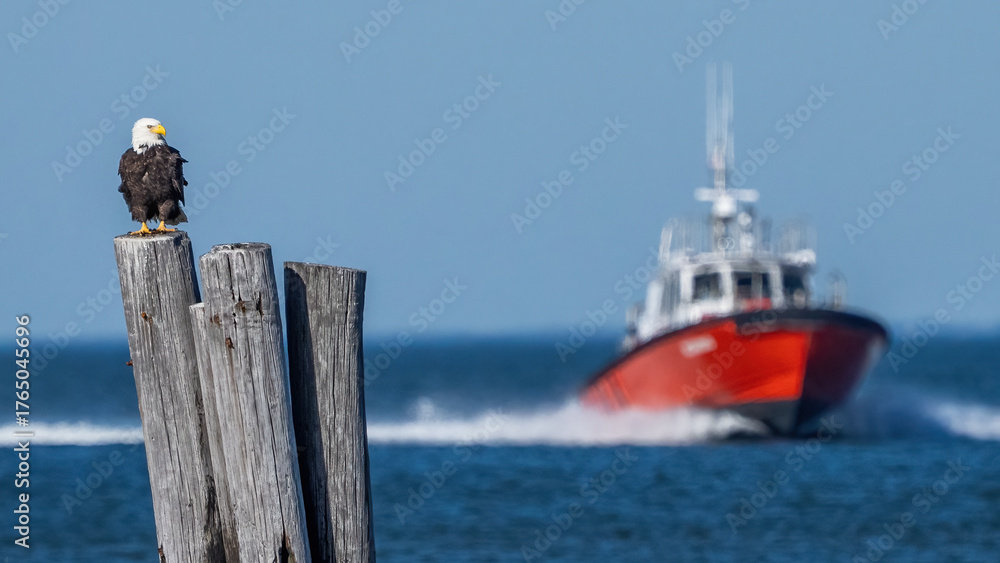 Tableau sur toile Bald Eagle on piling at Lynnhaven Inlet in Virginia Beach