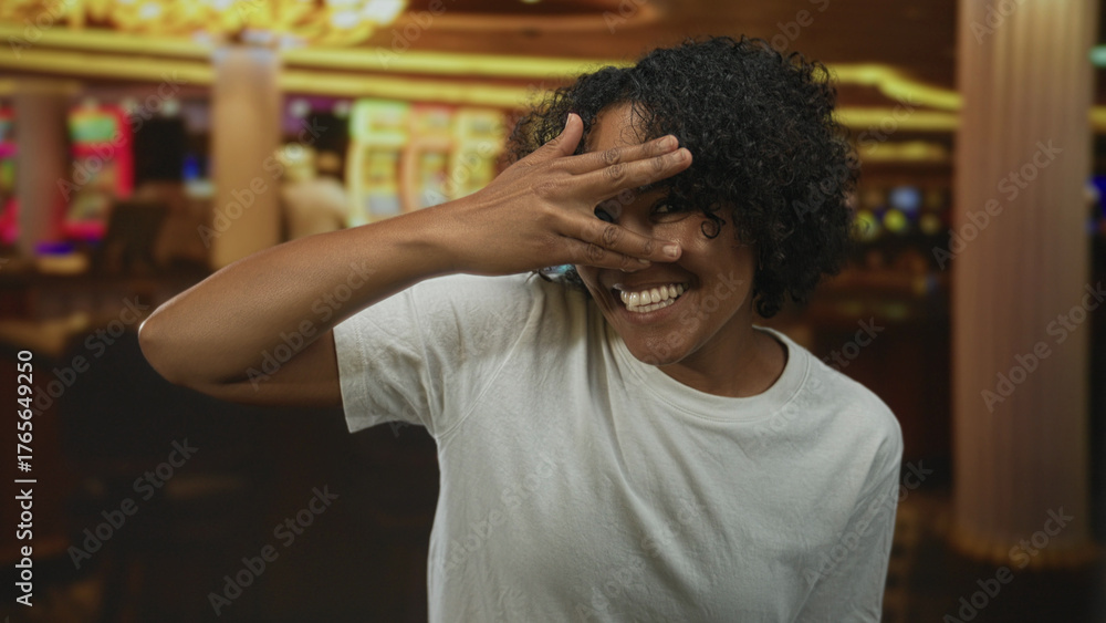 Tableau sur toile Woman covering eyes with hand and smiling behind fingers in casino building beside slot machines; excitement