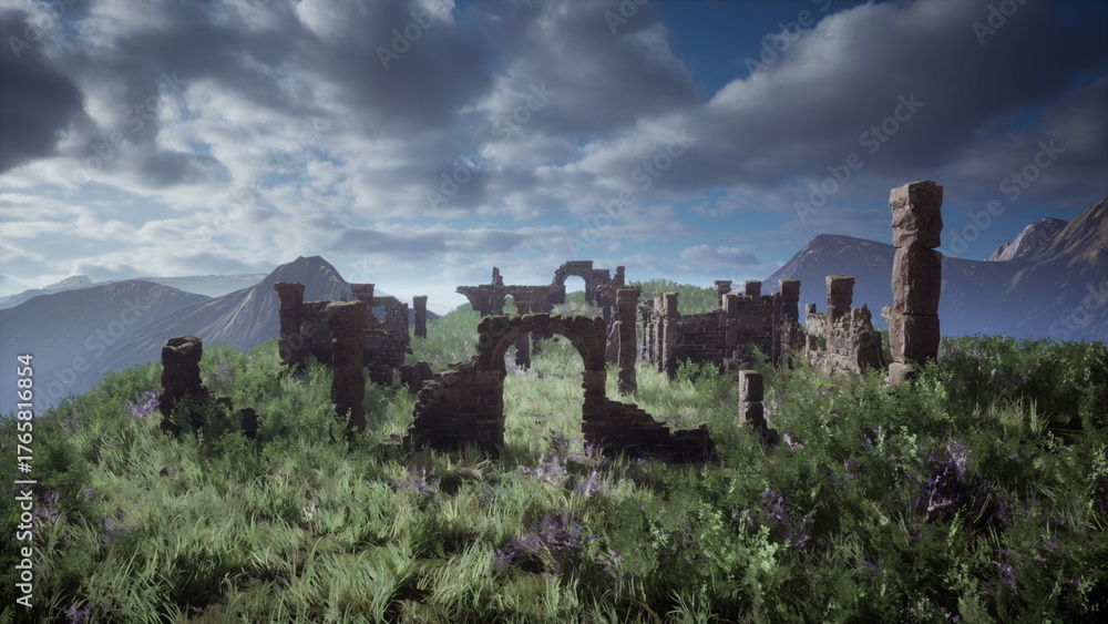 Tableau sur toile Mysterious remnants of a forgotten civilization rise from a vibrant green landscape