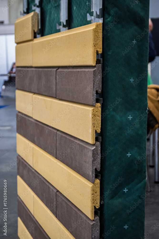 Tableau sur toile Close-up of a modern ventilated facade system showcasing alternating beige and brown cladding panels being installed over a green moisture barrier