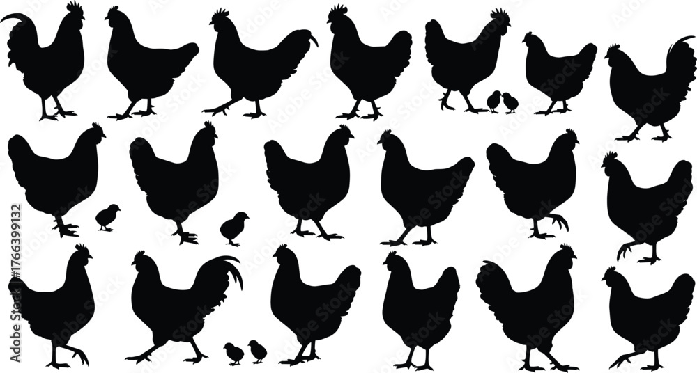 Tableau sur toile Chicken and chick silhouette set, black poultry vector, farm animal poses, walki