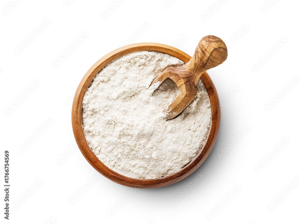 Tableau sur toile Wheat flour in wooden bowl with spoon isolated on white background with clipping path