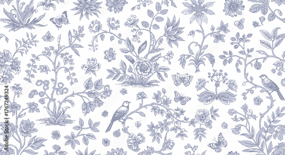 Tableau sur toile Toile de Jouy Blue Botanical Garden - Vintage Floral Pattern Vector