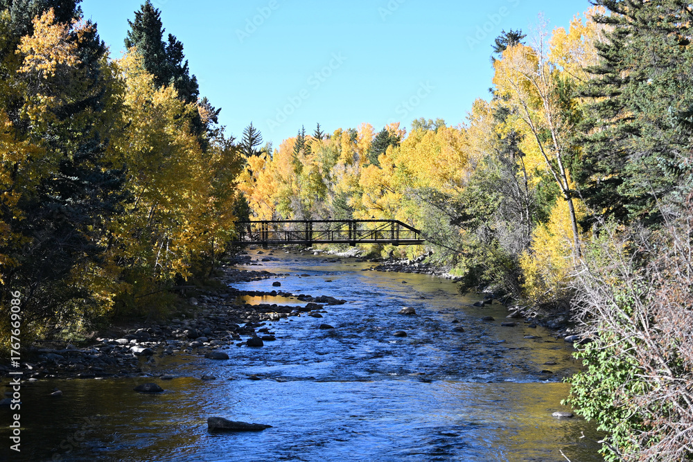 Tableau sur toile Pedestrian Bridge over River in the Fall