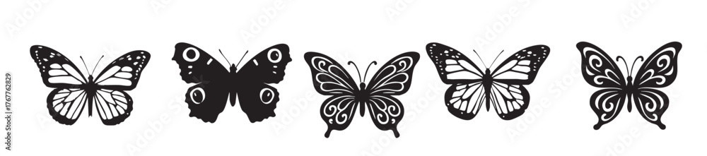 Tableau sur toile Set of black butterfly silhouettes isolated on white background illustrating wings and patterns