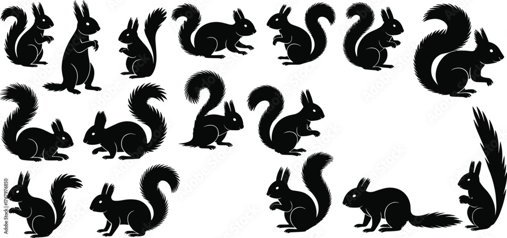 Tableau sur toile Squirrel silhouette set, bushy tail poses, wildlife vector illustration, black a