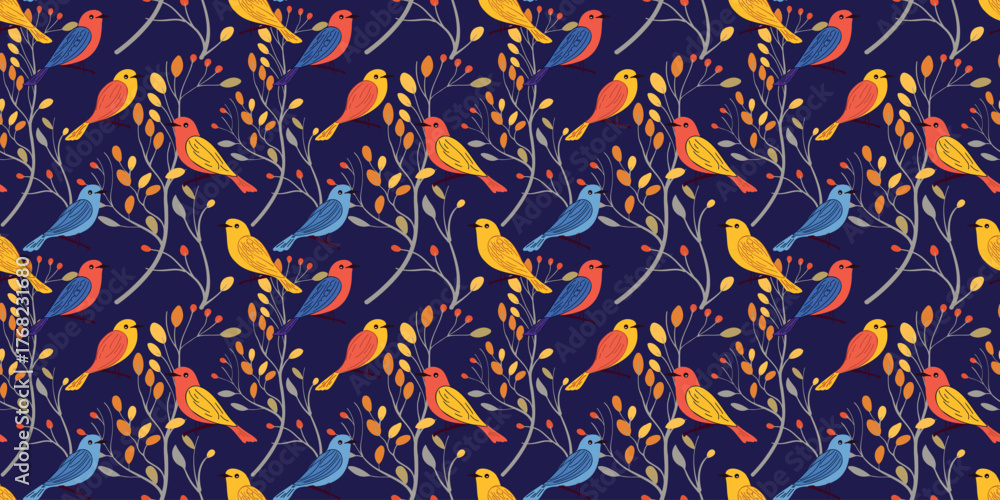 Tableau sur toile vector illustration seamless birds on branch pattern for nature and textile desi